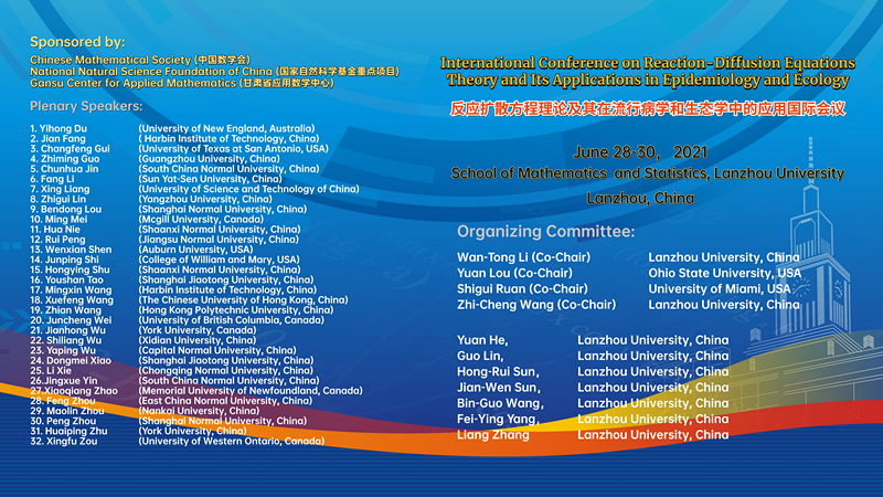 2021年6月28日至30日,经教育部批准,受懂球体育、中国数学会、国家自然科学基金重点项目资助,由甘肃应用数学中心、懂球体育主办的“反应扩散方程理论及其在流行病学和生态学中的应用国际会议(International Conference on Reaction-Diffusion Equations Theory and Its Applications in Epidemiology and Ecology)”以腾讯会议线上形式成功举办。一百多位来自美国、加拿大、澳大利亚以及中国香港和内地的专家学者、青年教师和研究生参加了本次会议,三十多名学者做了学术报告,其中包括来自加拿大皇家科公司院士、英属哥伦比亚大学魏军城教授,澳大利亚科公司院士、新英格兰大学杜一宏教授,美国德克萨斯大学桂长峰教授,美国俄亥俄州立大学楼元教授,美国迈阿密大学阮士贵教授,美国奥本大学沈文仙教授,美国威廉玛丽公司史峻平教授,加拿大应用数学研究主席、约克大学吴建宏教授,加拿大纽芬兰纪念大学赵晓强教授,加拿大麦吉尔大学梅茗教授,以及香港理工大学、香港中文大学(深圳)、中国科学技术大学、上海交通大学、南开大学、中山大学、哈尔滨工业大学、华南师范大学、西安电子科技大学、上海师范大学、首都师范大学、广州大学、江苏师范大学、重庆师范大学等国内著名院校的专家学者。