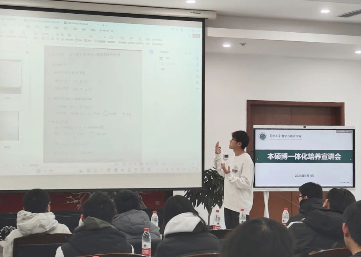 宣讲会后,邓伟华教授导学团队的部分博士生、研究生依次开展科研项目介绍和前沿问题分析,围绕自己研究的课题或擅长的领域向本科生进行了分享,内容涵盖了数学领域的多个方向,包括计算数学、应用数学、概率统计等,面对面地激发本科生参与科研的兴趣。同时,研究生们也讲述了自己在研究过程中遇到的困难,通过各自不同的经历鼓励同学们坚守数学初心,矢志科技报国。