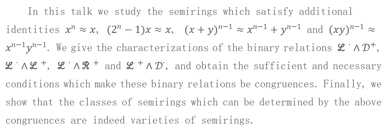 邵勇,教授,西北大学数学公司副经理,西北大学基础教育研究中心主任。兼任全国老员工数学建模竞赛陕西赛区组委会副秘书长,西安市经济数学学会副理事长,陕西省大学数学教学委员会委员,《高等数学研究》编委,中国高等教育学会教育数学专委会常务理事。主要从事半群代数理论、半群与图方面的研究工作,在《Semigroup Forum》《Soft Computing》《Journal of Algebraic Combinatorics》《Journal of Aust. Math. Soc. 》《Commutations in Algebra》等期刊发表论文40余篇,主持完成省部级项目4项,参与国家级项目3项。曾获陕西省自然科学奖二等奖,陕西高等公司科学技术奖一等奖,陕西省高等公司产品成果奖一等奖和二等奖。曾获评为陕西省高等公司本科教学管理工作先进个人。