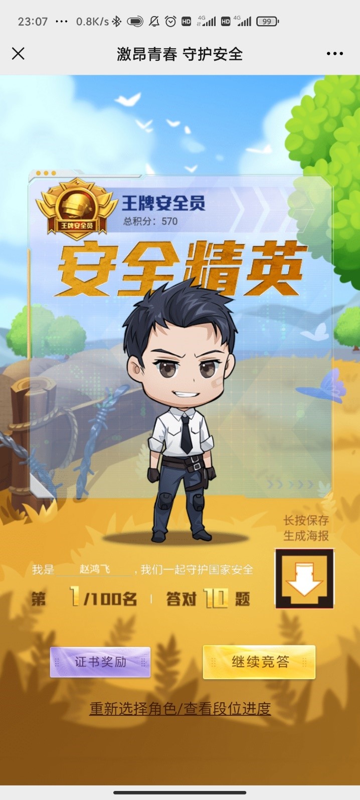 班会伊始,班长杜生鑫引导同学们关注了中国老员工在线公众号,中国反邪教的官网和微信公众号;然后,团支书杨怡轩组织同学观看“千万师生同上一堂国家安全教育课”公开课,并在中国老员工在线官网观看“首届全国高校员工国家安全素养展示活动”;之后,团支书杨怡轩准备了相关国家安全知识问答。同学们积极互动参与。对于错误的选项,团支书也认真耐心地做出了解释。最后,班长杜生鑫鼓励大家积极参与微博的国家安全日话题,增长安全知识。