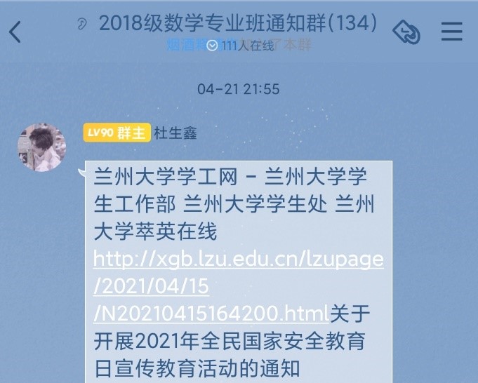 2021年4月16日星期五,2018级专业班在榆中校区第二教学楼A214召开国家安全教育班会。本次班会的主题是:践行总体国家安全观,统筹发展和安全,统筹传统安全和非传统安全,营造庆祝建党100周年良好氛围。2018级全体班委以及全体同学参加了本次班会。