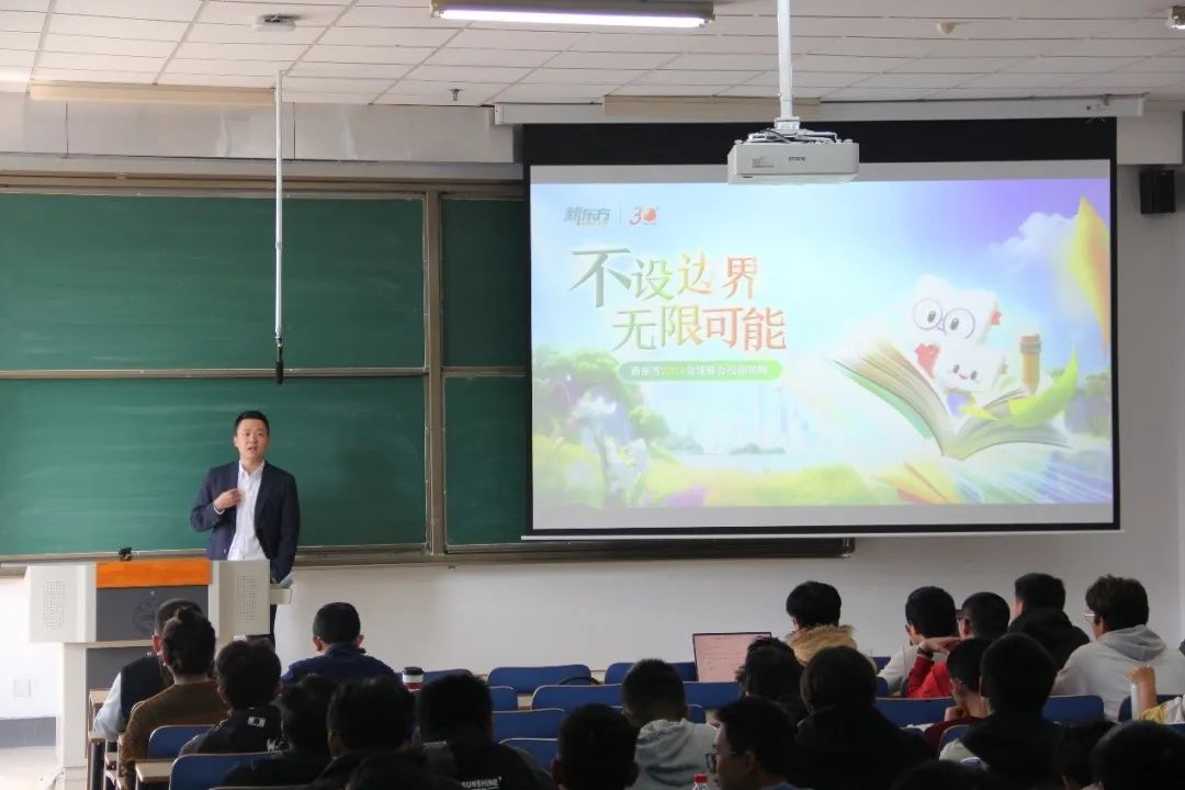 讲座上,陈孚董事长首先向同学们介绍了新东方的发展史、定位、业务体系以及新东方的使命、企业文化与践行的社会责任。新东方面对时代变革所做出的创新与突破启发同学们要将目光放长远,不放弃不气馁,“不设边界,无限可能”。
