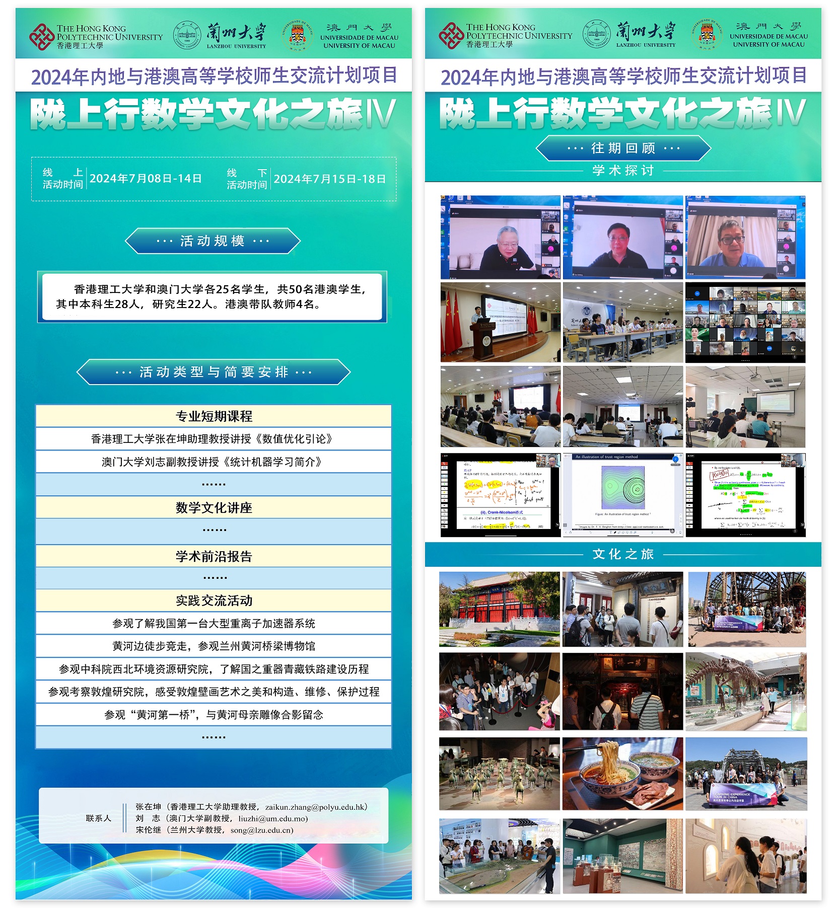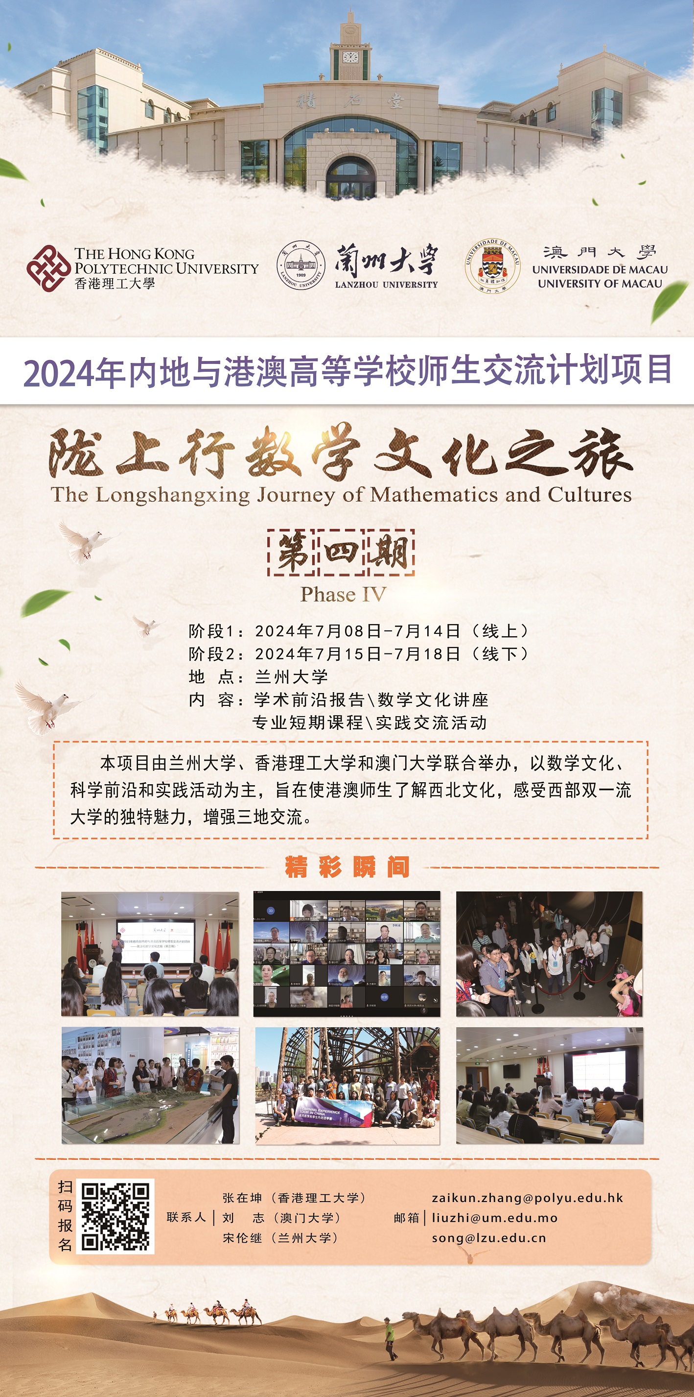 (3)教育部港澳与内地高校交流项目:“2024年内地与港澳高等公司师生交流计划项目——陇上行数学文化之旅(第四期)”于7月8日至18日在懂球体育举行。本项活动受教育部近年连续资助,由懂球体育承办,联合香港理工大学、澳门大学师生,通过专业短期课程、前沿讲座报告、实践交流活动等形式,交流探讨学科前沿进展与应用,促进两地学子探究学科问题、学习科研方法,产生文化共鸣,增强文化自信,提升自身能力和专业知识。