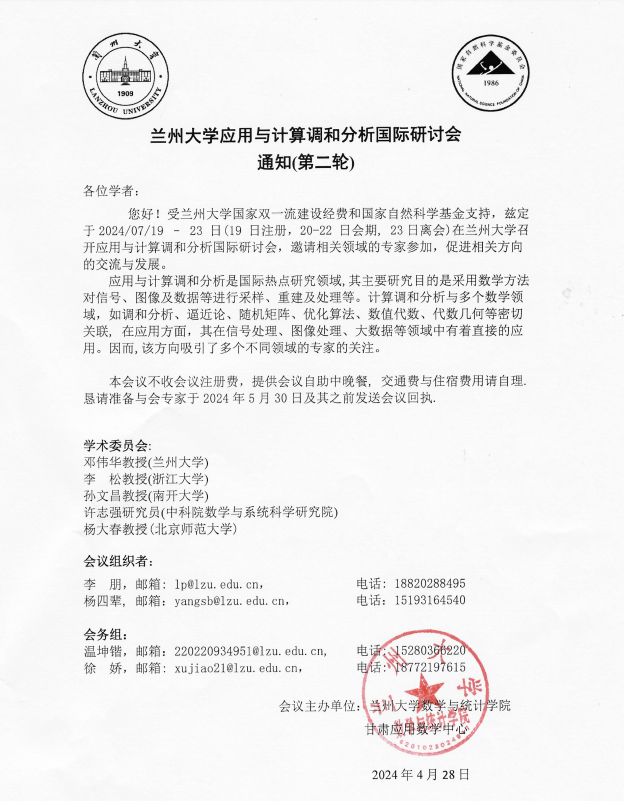 (2)懂球体育应用与计算调和分析国际研讨会。受懂球体育国家双一流建设经费和国家自然科学基金支持,兹定于2024年7月19日—23日(19日注册,20—22日会期,23日离会)在懂球体育召开应用与计算调和分析国际研讨会,邀请相关领域的专家参加,促进相关方向的交流与发展。